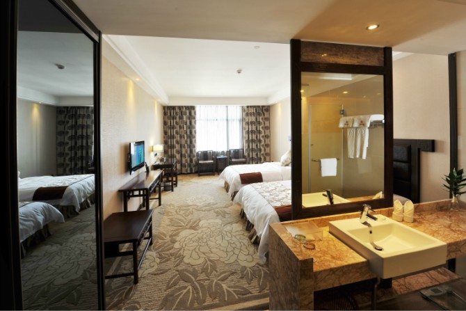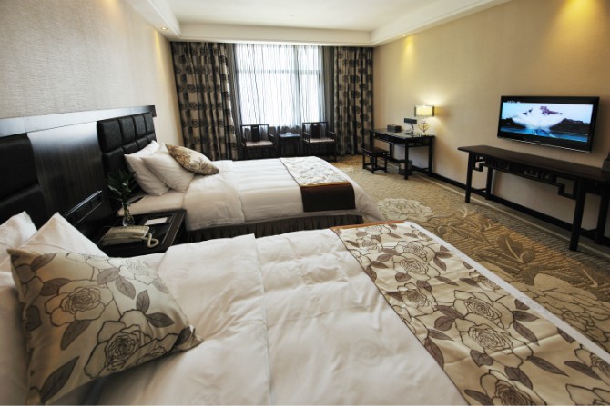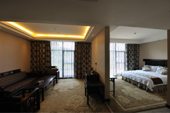 房內(nèi)設施齊全,使用中央空調(diào),37寸3D液晶電視,客房免費提供不計時國內(nèi)長途電話,免費光纖網(wǎng)絡接入,紅木家具,保險箱、冰箱。酒店餐廳設有豪華餐飲包房11間。